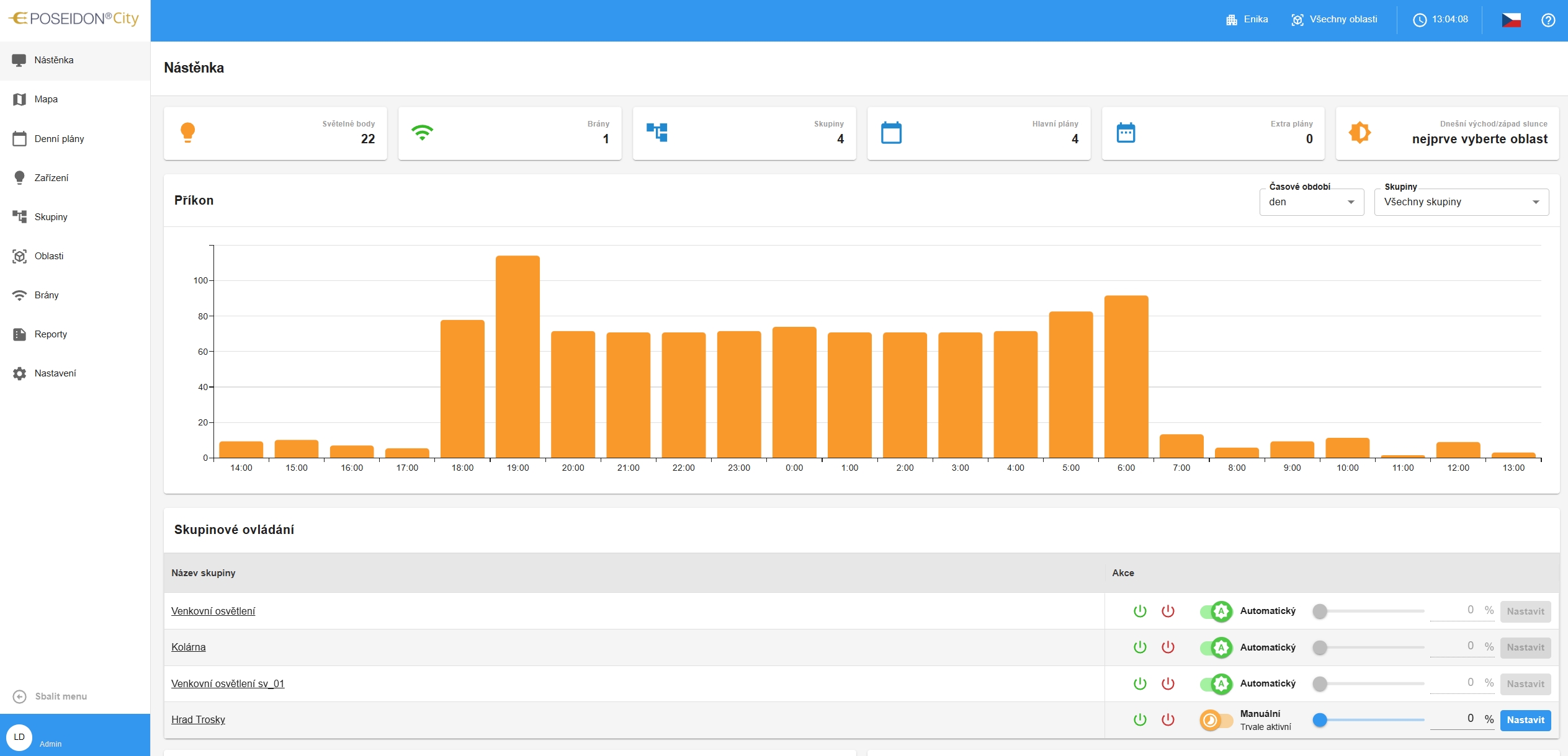 - Hlavní stránka zobrazuje aktuální stavy vybraných skupin svítidel. Zobrazuje také spotřebu elektrické energie pro jednotlivá svítidla nebo světelné skupiny, a to jak pro daný den, tak i měsíc nebo rok.