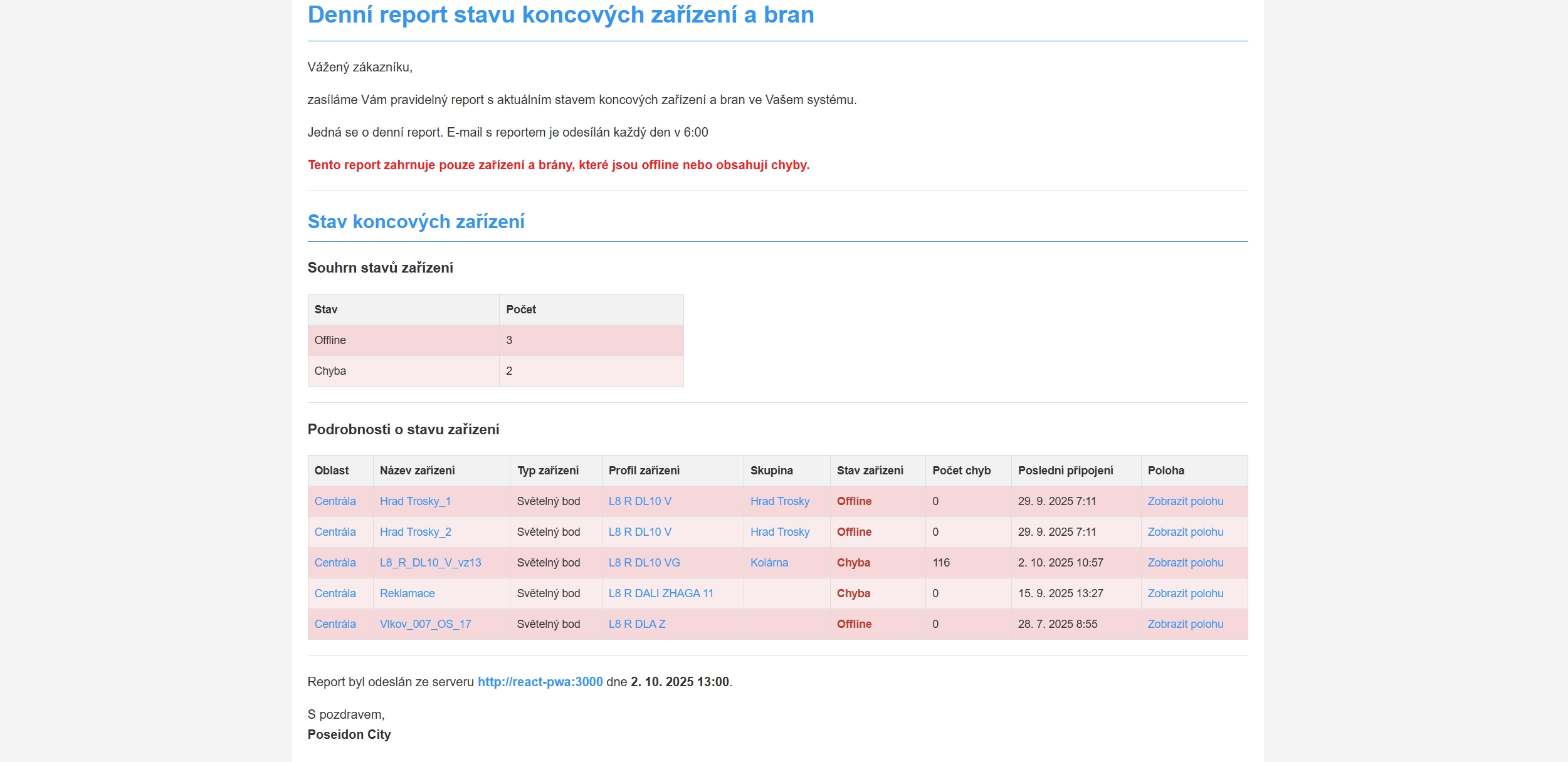 Hlášení probíhá pomocí e-mailové notifikace dle předchozího nastavení a přehledu v řídicím systému POSEIDON® City.
