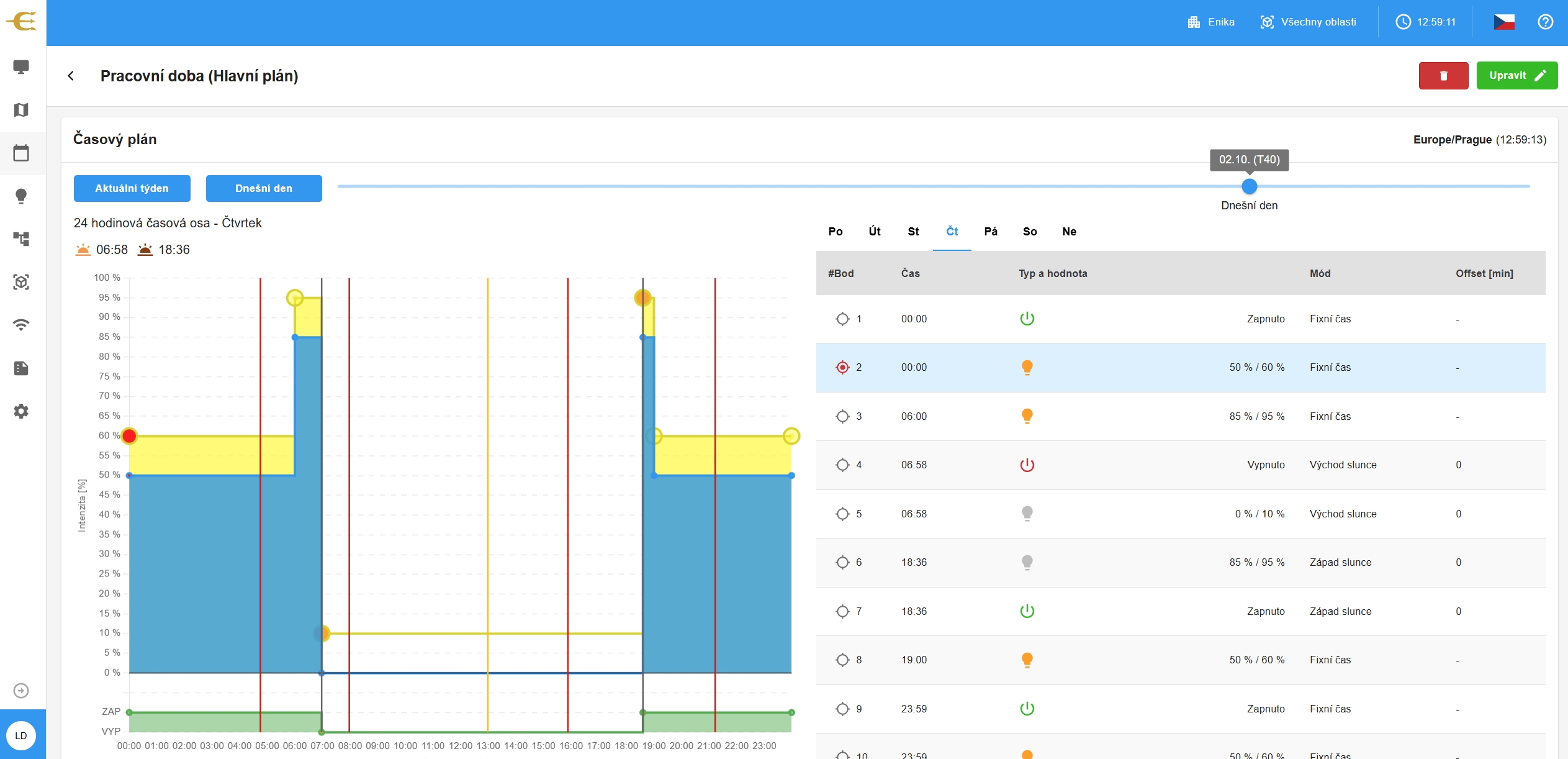 - Flexibilní správa veřejného osvětlení pomocí tvorby časových plánů a extra plánů. Uživatelé mohou snadno nastavit různé rozvrhy s možností detailní definice konkrétních dnů, čímž zajistí optimální provoz a úsporu energie podle aktuálních potřeb.